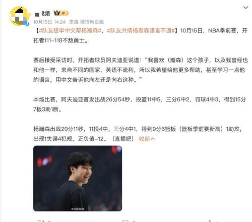 除此之外,在帶領(lǐng)球隊(duì)結(jié)束了對(duì)陣勇士的第二場(chǎng)比賽之后,阿夫迪亞在賽后的采訪中盛贊楊瀚森,直言自己非常喜歡這名年輕球員。在他的身上看到了自己剛剛來到NBA發(fā)展時(shí)候的狀態(tài),非常的努力刻苦,而且非常的謙遜。所以為了能夠更快讓這一位小老弟適應(yīng)在這邊的工作,阿夫迪亞主動(dòng)學(xué)習(xí)中文,學(xué)習(xí)一些簡(jiǎn)單的詞匯,未來想要在場(chǎng)上用中文和他進(jìn)行溝通擋拆。一方面這樣能夠減少楊瀚森的壓力,讓雙方配合起來更加的順暢。另外一方面也可以形成一種加密語言,因?yàn)閲?guó)外的球員都聽不懂中文。