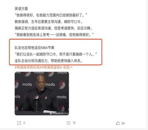 從最近半年的表現(xiàn)來看,我們當(dāng)然不擔(dān)心楊瀚森內(nèi)向的問題,因?yàn)樗男愿穹浅5幕顫娡庀?,平時(shí)在球隊(duì)也會(huì)主動(dòng)和教練以及隊(duì)友們搭話,包括和老大哥之間的相處也非常的愉快。除此之外,在最近三場(chǎng)季前賽比賽結(jié)束之后,我們又得知了一些非常好的消息,楊瀚森在開拓者這邊也是有大哥罩著的。