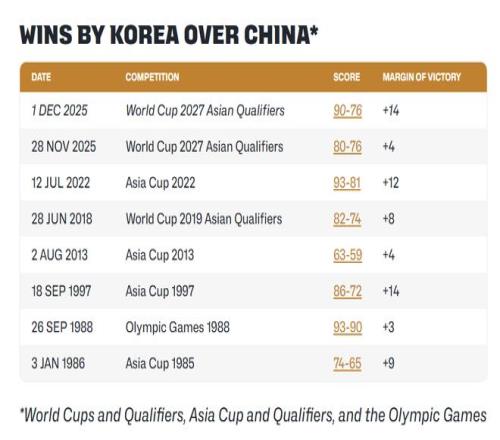 14分是近年來韓國隊贏中國男籃的最大分差/圖片來源:FIBA官網(wǎng)
