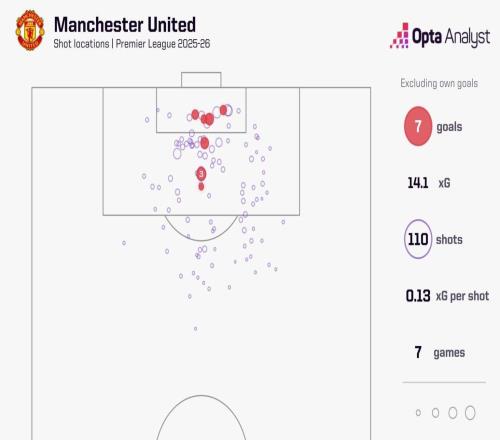 曼聯(lián)前7輪完成110次射門(mén)、創(chuàng)造14.1預(yù)期進(jìn)球,均高居英超第一